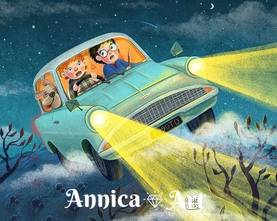 • Vibrant cartoon-style artwork inspired by Harry Potter’s magical world